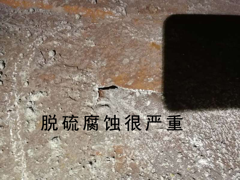 脫硫塔壁漏漿、脫硫塔噴淋層下方襯膠鼓包、局部區域襯膠脫落、已暴露的塔壁鋼板不同程度的腐蝕、塔壁嚴重減薄、塔壁鋼板腐蝕穿孔、漿液管道支撐架根部嚴重腐蝕。